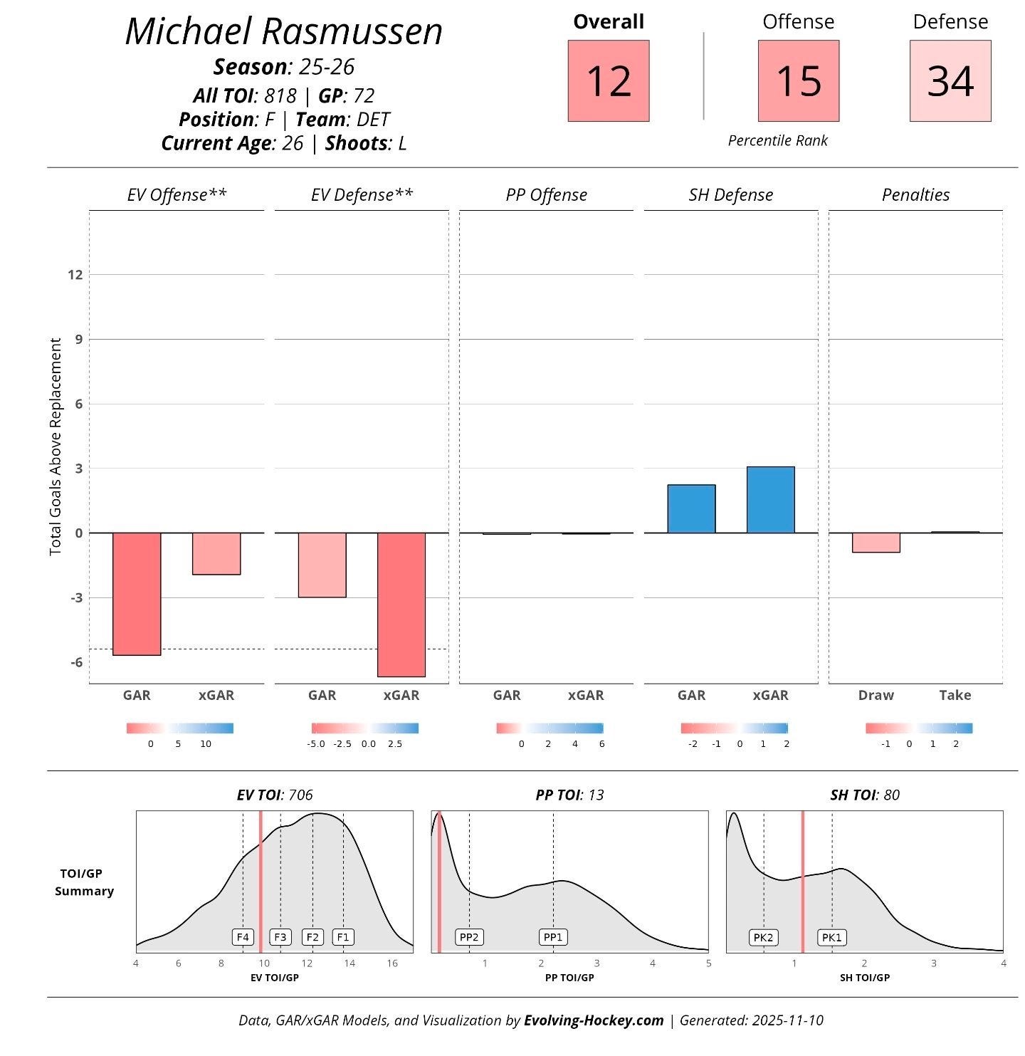 The top-six, despite Marco Kasper’s cold streak and Alex DeBrincat’s goal drought, looks to be in a good place once luck returns to their side. When you take a closer look at the bottom-six, however, questions begin to arise. Michael Rasmussen has just three points in 14 games and some of the worst advanced analytics in the league: