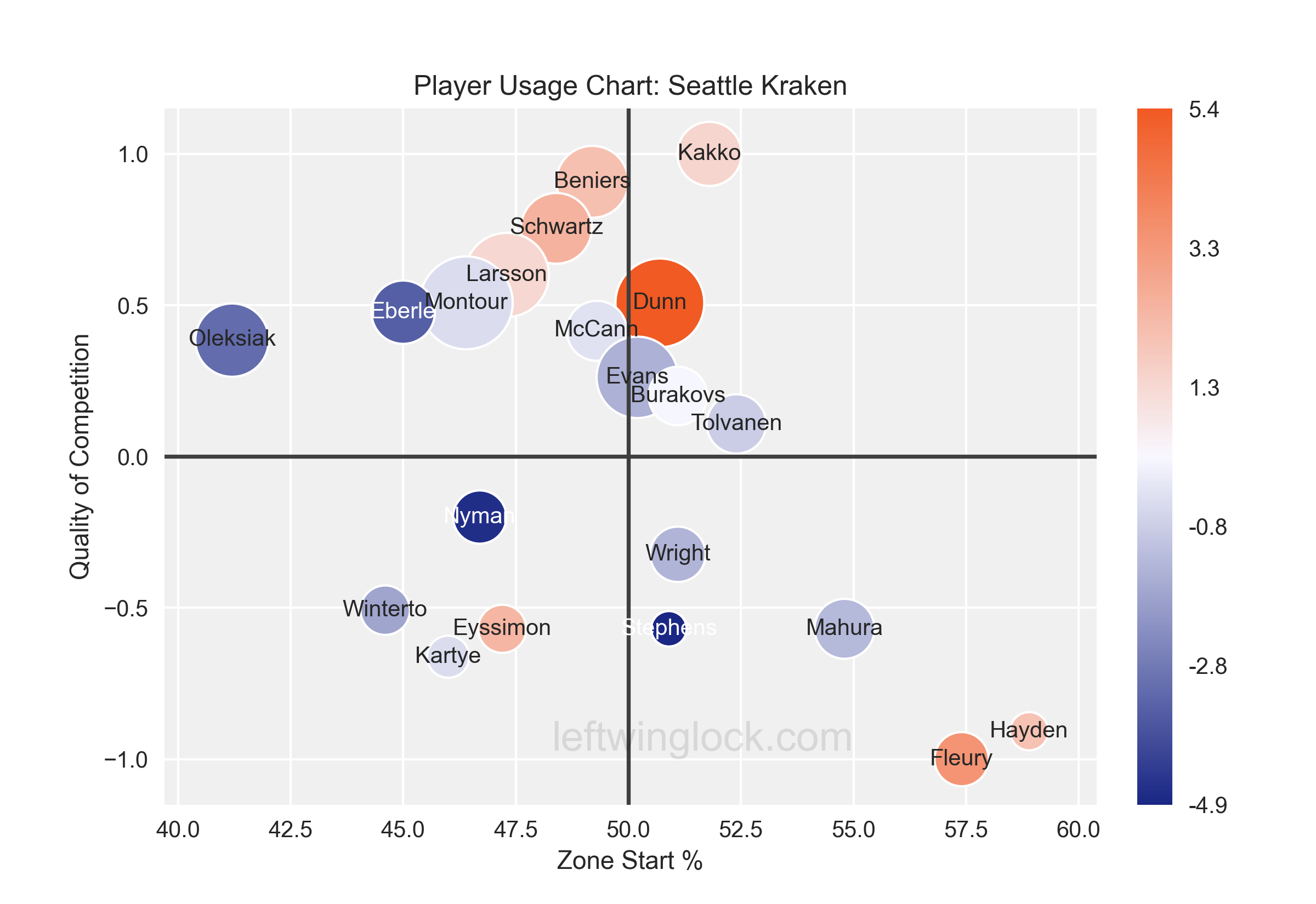 Oleksiak spent the majority of last season alongside line mate Brandon Montour, occasionally working shifts with Adam Larsson, as well. He played the third-toughest minutes out of the Kraken’s defensive corps last season, starting the vast majority of his shifts in the defensive end. Our friends at Left Wing Lock have prepared this fun chart to show where (and how) Oleksiak was deployed last season: