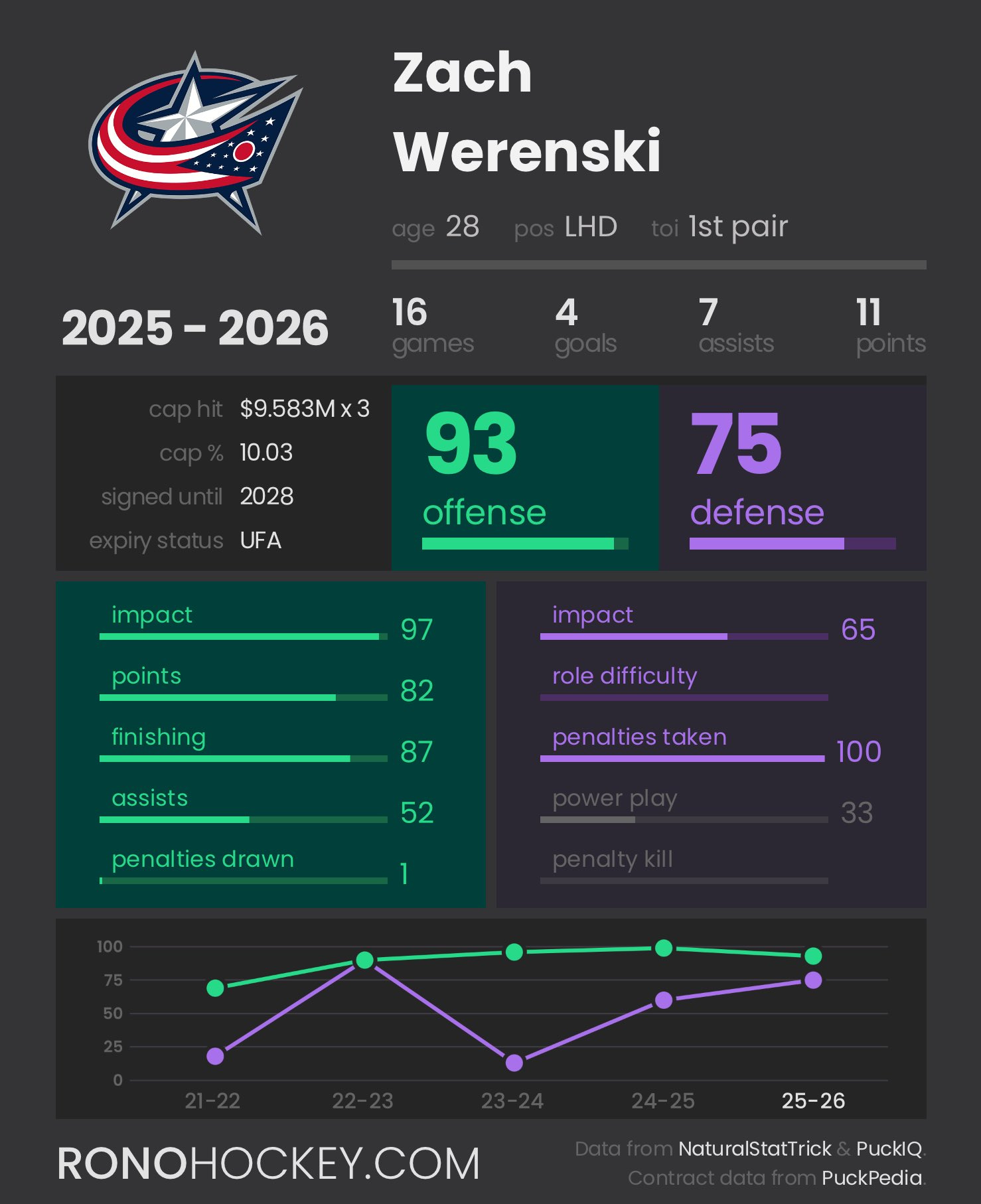 Additionally, Werenski has a no movement clause (NMC) to his contract which becomes a 10-team trade list in 2027-28. With that said, his destiny rests squarely in his hands. If he wants to stick it out, he’s got the rest of this season and two seasons after to figure out his future in Columbus. But, if he’s decided he’s had enough…he can opt out of his NMC.