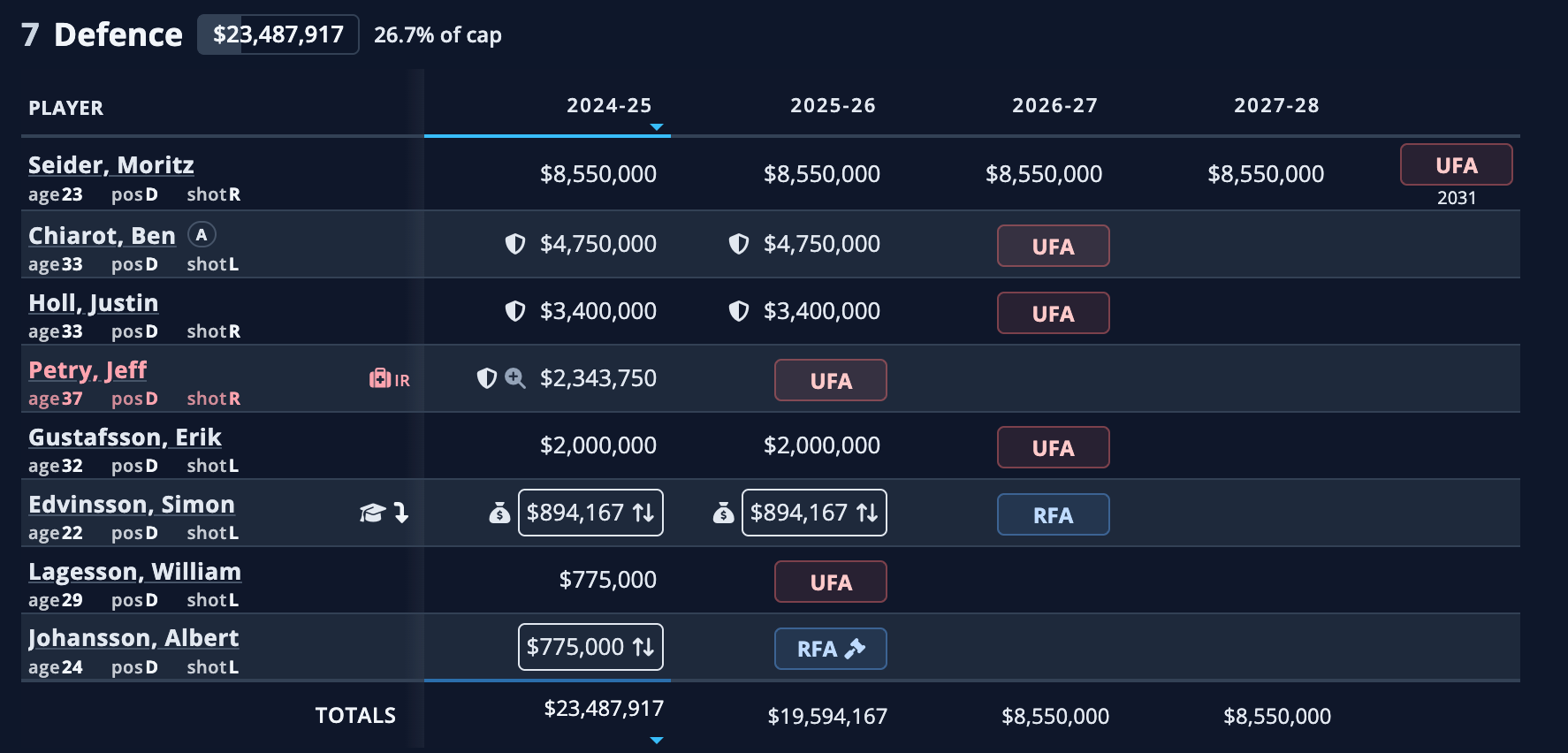 Nearly $12.5M of the team’s salary is dedicated to Ben Chiarot, Justin Holl, Jeff Petry, and Erik Gustafsson — ages 33, 33, 37, and 32, respectively. Three of these four players are analytic black holes, the exception being Gustafsson, who is more of a low-event, play-stopping style of defenseman. Moritz Seider and Simon Edvinsson are fighting for their lives out there. When a third of your defensive corps has to work overtime to make up for the mistakes of the other two thirds, you’re in trouble.