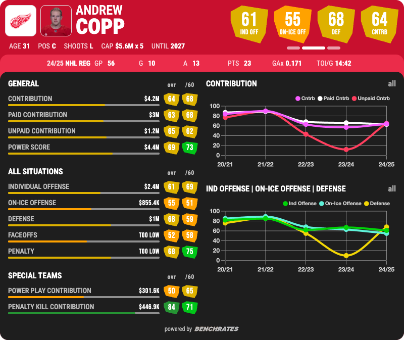 Last season’s injury-shortened campaign was his statistical worst with the Wings. In 56 games, he managed just 10 goals and 23 points. Part of this is due to a coaching change. Another is due to his injury. But, ultimately, a large part is Copp’s role with the Wings. He’s been asked to punch above his weight more times than he’d like, playing tougher minutes with more offensive-minded forwards.
